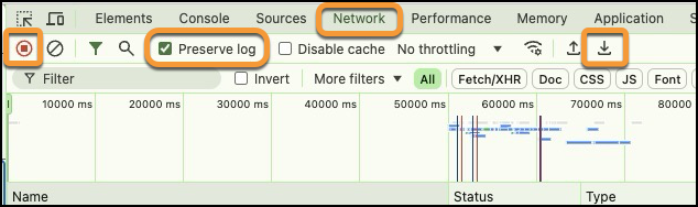 InformationBodyIn Chrome: Click on the options menu at the top right corner of your Chrome browser window.Select More Tools > Developer Tools.Select Network on the top in the middle. You may need to click >> and select from a menu. Tick the Preserve Log checkbox.Ensure the record icon is red. Refresh the page.Leave this panel open and perform the error prone task. You will see various columns such as Name, Status, Type etc. populate rows as you do things.Click the download arrow to Export HAR (sanitized)...Save the .har file and send it to us. In Edge: Open Microsoft Edge and go to the page where the issue is occurringClick the 3 dots on the top right corner > More Tools > Developer Tools Then, within the Developer Tools: Select the Network panel tab. You may need to click >> and select from a drop down list.Confirm the Preserve log checkbox is ticked. Confirm the record icon is red.Click Clear network log, refresh the page, and repeat the error prone task.Click Export HAR to export the recorded session to a HAR file. The icon is an arrow pointing downwards to a horizontal line. It's on the same row as the Preserve log box. If you can't see it, resize the vertical bar and resize the Developer Tools window. TitleHow do I create a HAR file?URL NameHow-do-I-create-a-HAR-file