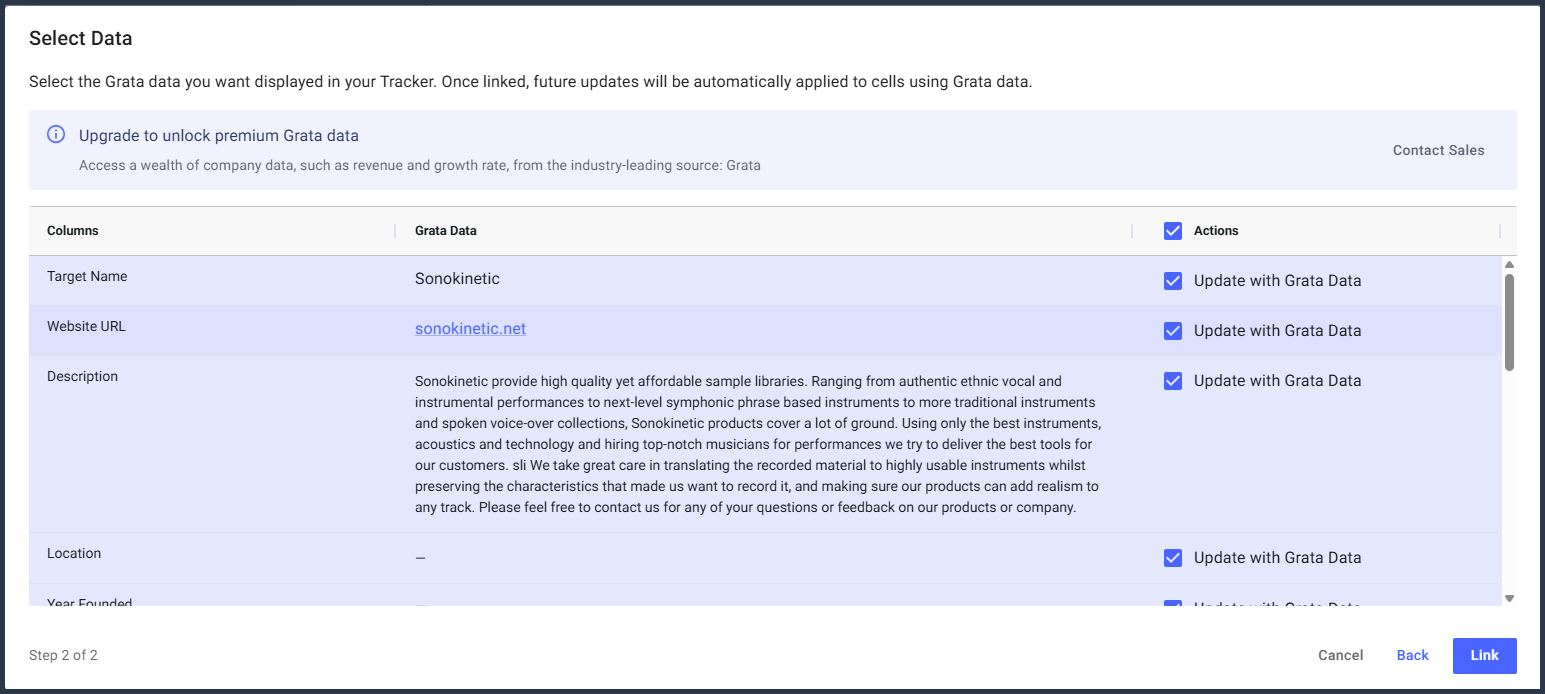 InformationBody Grata is an all-in-one deal-sourcing tool. With Grata you can: Navigate the private markets with confidenceAccess 17M+ companiesMap fragmented marketsFind precise deal compsConnect with qualified buyers and more Find Grata by clicking into Apps on your Datasite Home page. Integrate Grata into your Datasite Pipeline project What is Grata for Pipeline?How to use Grata for PipelineGrata Dataset FieldsFAQs What is Grata for Pipeline? Grata for Pipeline integrates Grata’s extensive company database with Pipeline, allowing you to quickly enrich your trackers with up-to-date information on millions of companies, eliminating the need for manual research and helping you move faster on deals. How to use Grata for Pipeline Create a new tracker in Pipeline.Select the Grata column from the available column types. Enter the company name or web address (excluding 'www.' is recommended for better results). Choose the correct company profile from the search results. Select the data fields you want to include. Click Link to populate the tracker with Grata data. You can re-link or manually edit the data at any time. Grata Dataset Fields Pipeline customers get the first 6 Grata columns free with their subscription. If you'd like to access the additional 11 columns, please contact your Datasite sales representative. Target Name (match)*Website URL*Description*Location*Employees on Professional Networks*Year Founded*RevenueEmployee EstimateGrowth Rate (1mo, 3mo, 6mo, 1yr)OwnerOwnership StatusIndustryFunding StageTotal FundingLast Funding (months since)InvestorsExecutives (name, title, email, LinkedIn) * Included with Pipeline FAQs How much does Grata integration cost? The first 6 columns of Grata data are free. Contact your sales representative if you have additional pricing questions. What is the difference between the free and premium version of the Grata add-on? Free Version:All Pipeline customers automatically receive access to 6 core Grata data fields: Target NameWebsite URLLocationEmployees on Professional NetworksYear FoundedDescription These fields are visible and usable without any additional subscription. Premium:Customers who subscribe to the Grata Enrichment Add-on unlock 11 additional data fields (for a total of 17), giving them a more complete view of each company. These fields are unblurred and selectable in the tracker: RevenueEmployee EstimateGrowth Rate (1mo, 3mo, 6mo, 1yr)OwnerOwnership StatusIndustryFunding StageTotal FundingLast Funding (months since)InvestorsExecutives (name, title, email, LinkedIn) How do I upgrade to the full Grata dataset? Contact your Datasite sales representative. Are there any limits to the column count with this new Grata integration? Pipeline trackers have a combined column limit of 30 for both Formula and Grata columns. Try removing unused columns or formulas to free up space if needed. Can I update or unlink Grata data once it’s been added to a tracker? Yes. After a row is linked to Grata: Open the Manage modal by clicking the Linked icon.From there, you can: Add or remove Grata columnsView which fields are syncedClick Unlink Target to stop syncing from Grata while keeping the current data in place Will Grata data update automatically, or do I need to refresh it manually? Once a row is linked, any updates from Grata are pulled into the tracker without user input. This ensures the data stays current without manual refreshes. Can Grata data be used with Dashboard widgets? Yes, the Grata fields can be linked to Dashboard widgets. Fields with numbers, such as Revenue and Employee Estimate are the best candidates for widgets. Can Grata read data that I enter into a tracker? No, Grata is unable to read custom data that is entered. The only thing that Grata reads is the target information that is submitted to link with Grata data. TitleIntegrating Grata with your Pipeline projectURL NameIntegrating-Grata-with-your-Pipeline-project